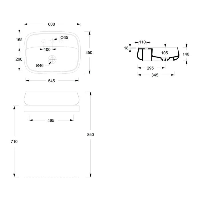 Раковина накладная Alice Nur 60x45xВ15 Plan, с отверстием под смеситель, белый матовый, 33210109