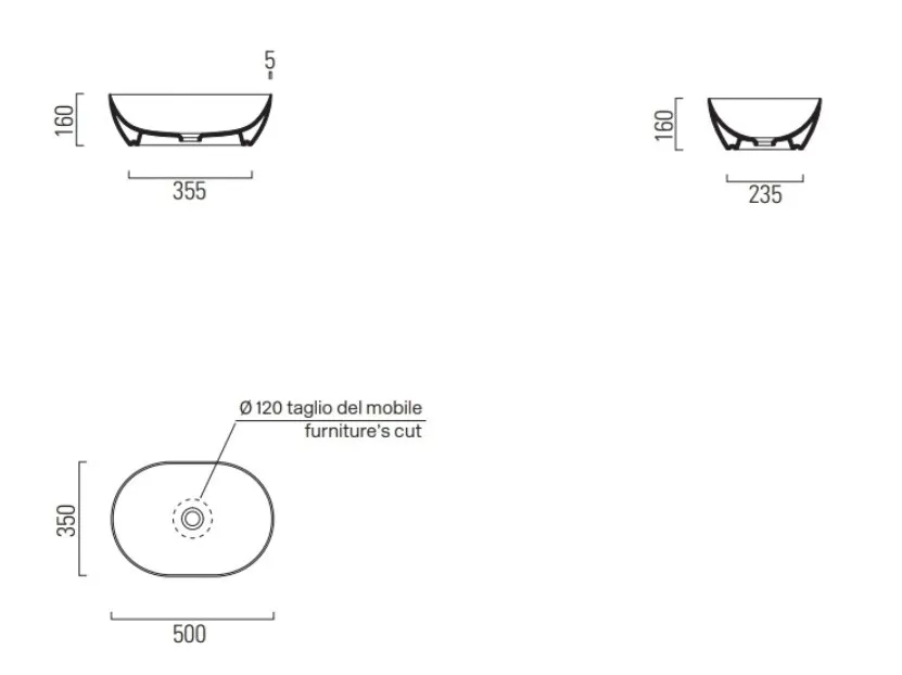 Раковина имеет овальную форму и не предусматривает отверстие под смеситель, что дает возможность свободно выбирать расположение крана.