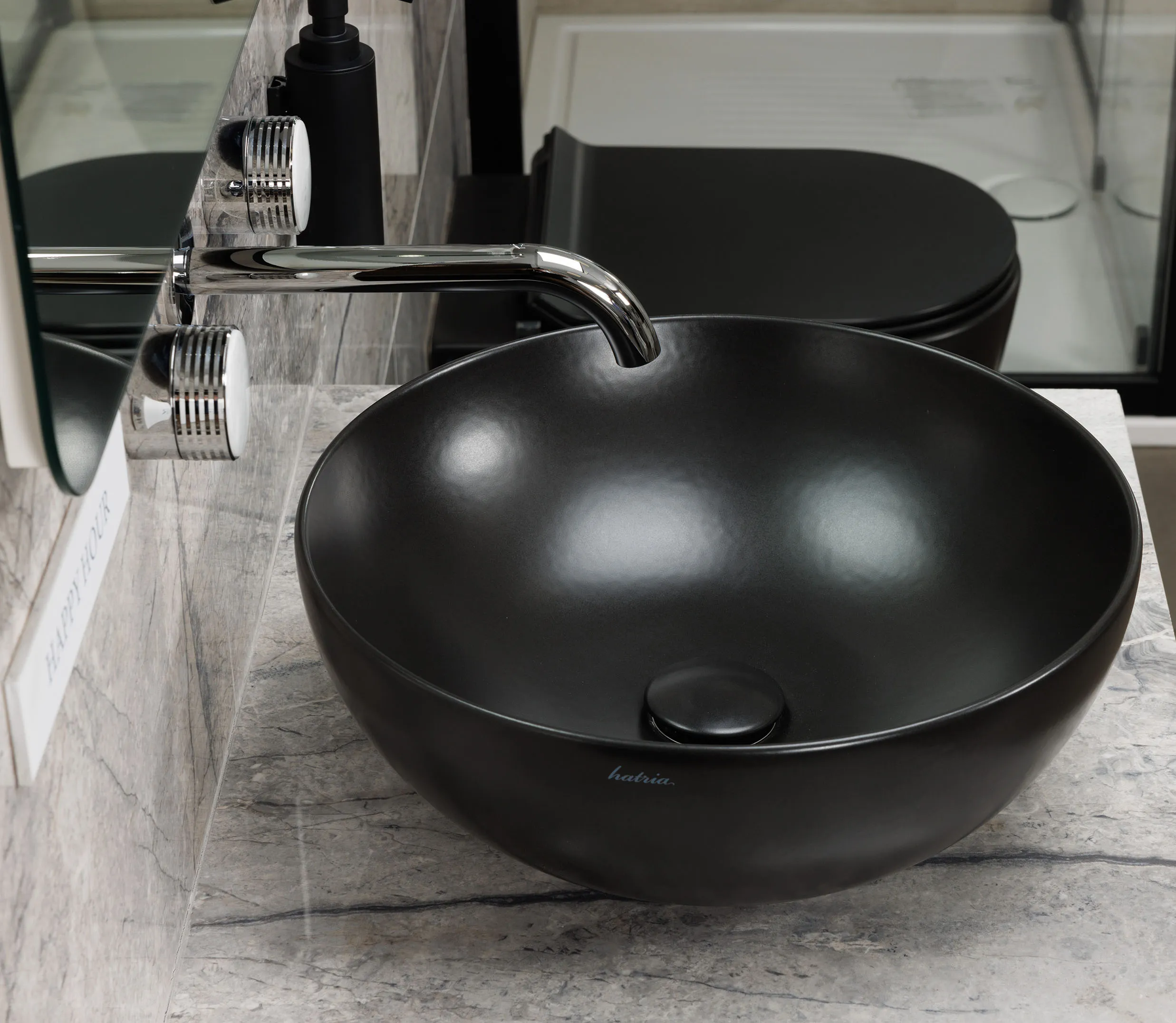 Раковина накладная HATRIA HAPPY HOUR A0Y1VF02, без отверстий для смесителя, без перелива, диаметр 44 см, цвет черный матовый. Донный клапан и сифон приобретаются отдельно.