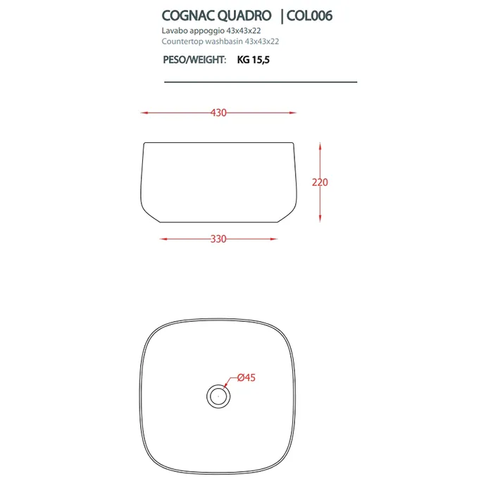 Раковина накладная Quadro ArtCeram Cognac 43x43хh22,5, без отв под смеситель, без перелива, nero roma COL006 20 00 nero roma *0 САЛОН
