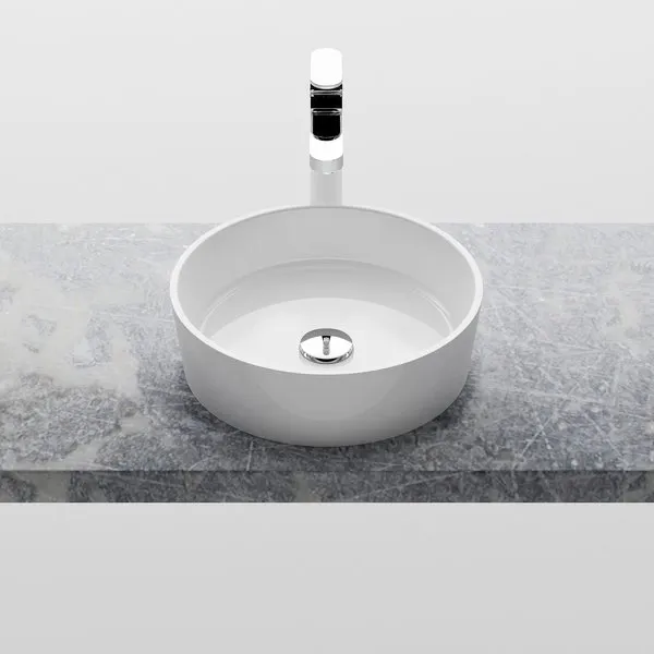 Авторский умывальник изготовленный из литого мрамора, дизайн которого основан на элементарной геометрической форме круга. Идеально сбалансирует в ванной комнате элементы прямоугольной формы, такие как плитка душевого уголка или мебель. Подходит для установки на столешницу.