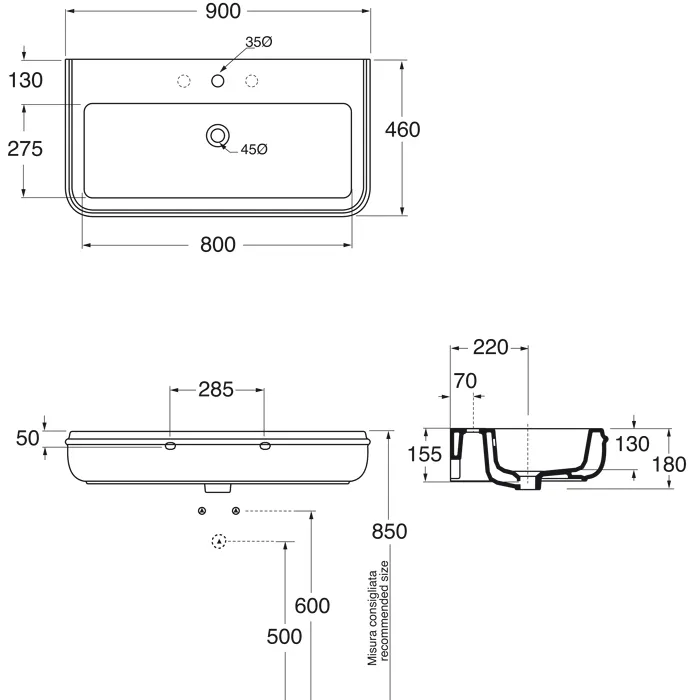 Раковина подвесная Azzurra Charme 90х46, с 1отв для смесителя, белый CHLP09046T0MBI/(CHA290 bi)*1