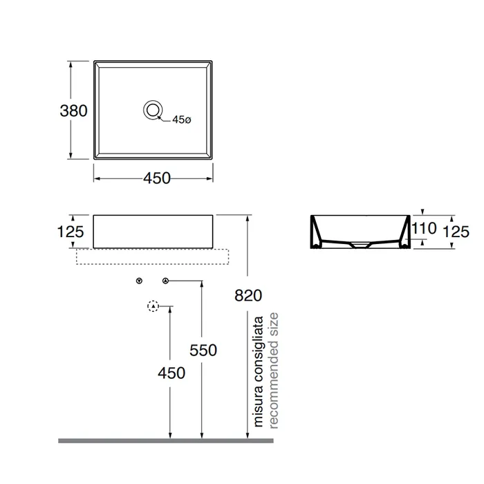 Раковина подвесная Azzurra Elegance Squared 45х38х15 без отв. под смеситель, cenere ELLA045380Q0CE/(EQA4538*CE)*0