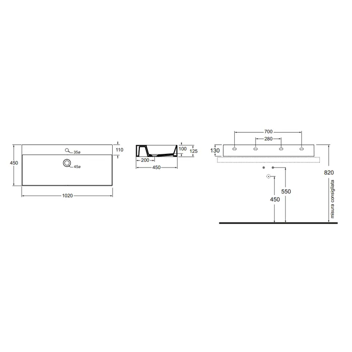 Раковина подвесная Azzurra Elegance Squared 102х45см с 1 отв. под смеситель, белый ELLP102450QMBI/(EQA102M bi)*1