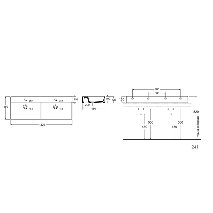 Двойная раковина подвесная Azzurra Elegance Squared 122х45см с 2отв. под смеситель, белый ELLP12245DQMBI/(EQA122 2V/2F bi)*2