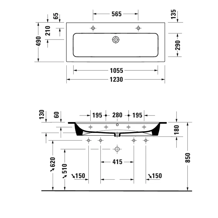 Duravit ME by Starck Раковина для мебели 1230х490 мм, с переливом, с площадкой, с 2 отв. под смеситель, Цвет белый