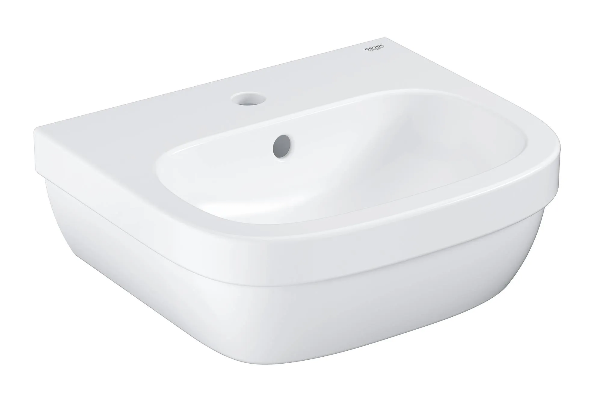 Подвесная мини-раковина размером 450x400, с одним отверстием под смеситель, с переливом.