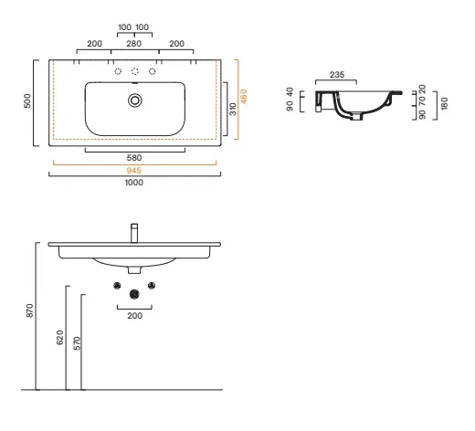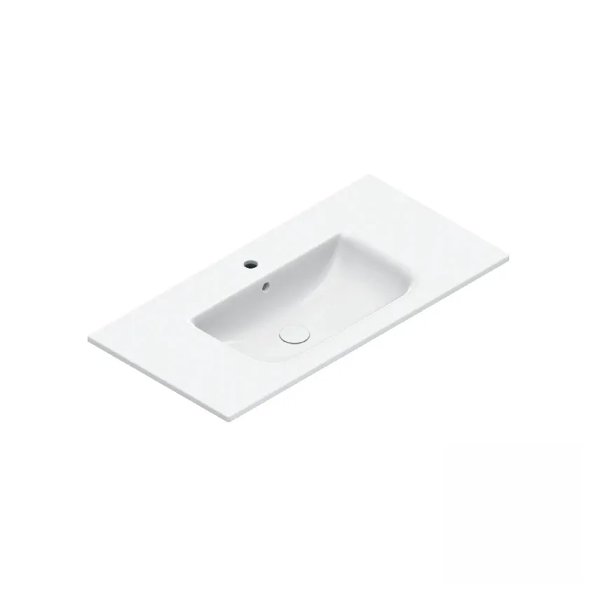 Раковина прямоугольной формы, изготовлена из керамики с глянцевой поверхностью. Размеры изделия составляют 100 см в ширину, 50 см в глубину и 17,8 см в высоту. Она оснащена одним отверстием под смеситель и может быть установлена как подвесная или на мебель. Чистый вес изделия — 26 кг.