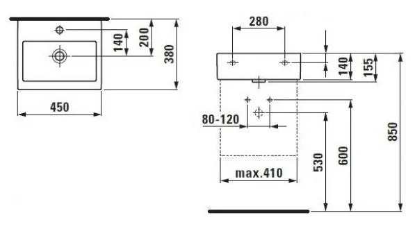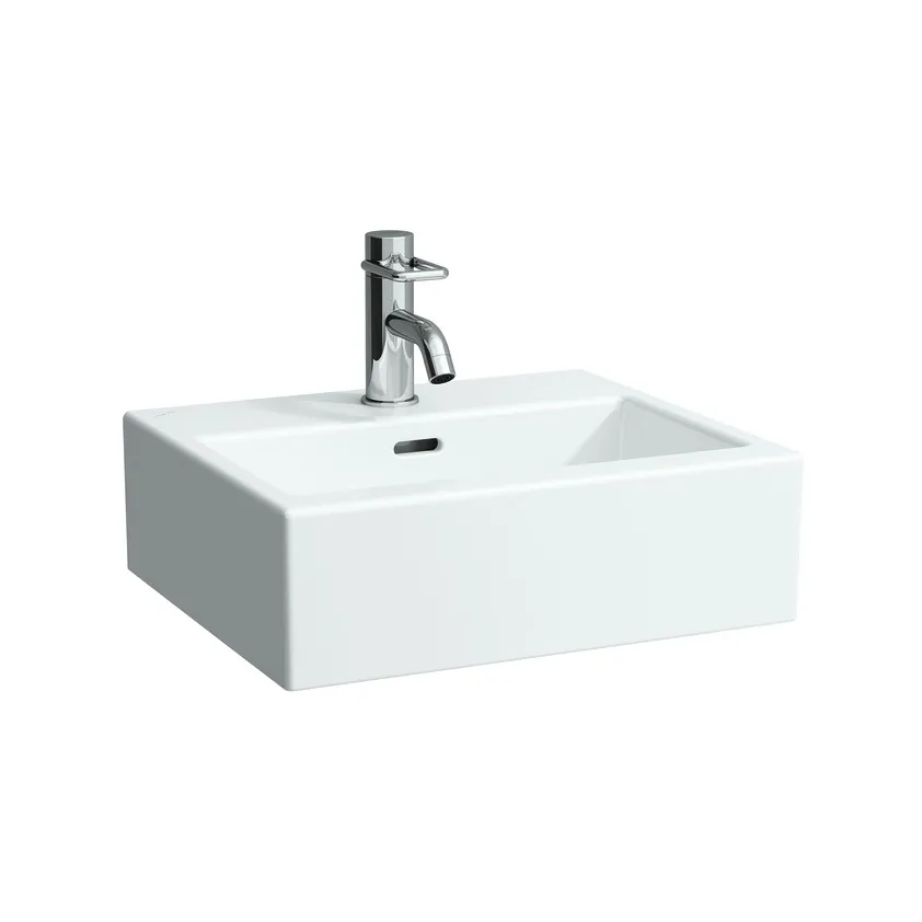 Керамическая подвесная мини-раковина (отшлифована) с отверстием под смеситель в размере 450x380x155 мм, цвет белый.