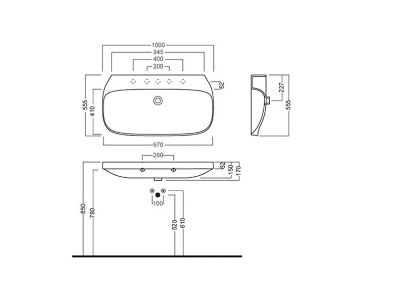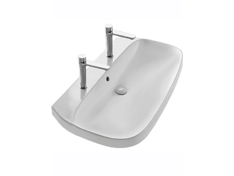 Раковина подвесная HATRIA ABITO YXX9, без отверстий для смесителя (намечено 5 отверстий), с переливом, размер 100х54 см, цвет белый. Крепления в комплекте. Донный клапан и сифон приобретаются отдельно.