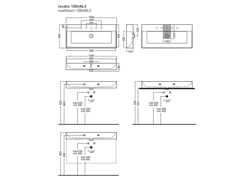 Раковина подвесная или встраиваемая в мебель HATRIA BAHIA_13 BH1000465011TS, одно отверстие для смесителя по центру, с отверстием перелива, размер 100х46.5x13 см, белая. Крепления, полотенцедержатель, донный клапан, сифон, структура под раковину заказывается отдельною. Данная раковина может выпускаться как накладная и без перелива.