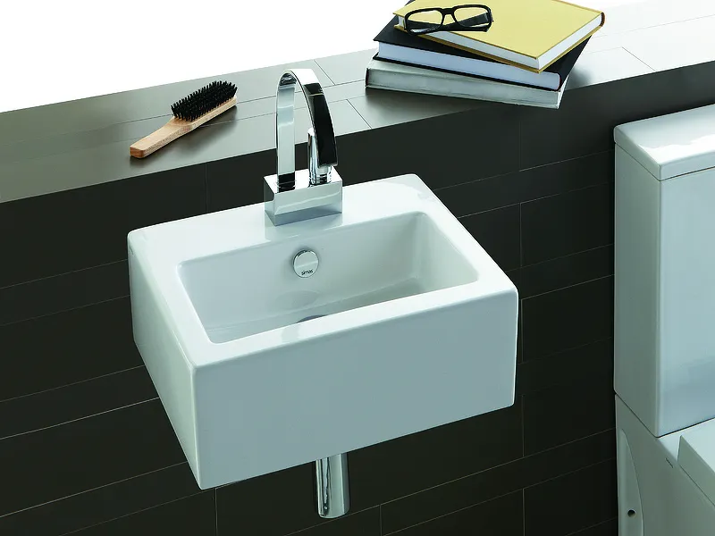 Подвесная раковина имеет прямоугольную форму и компактные размеры, что делает её идеальным выбором для небольших ванных комнат.