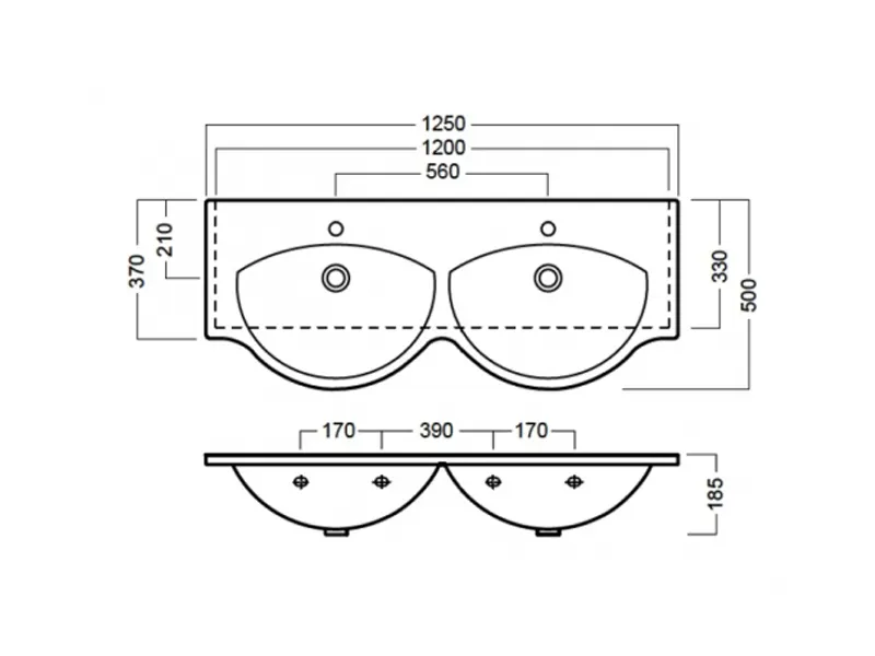 Раковина двойная подвесная HATRIA SOPHIE Y0Q501, размер 125х50 см, цвет белый. Раковина с двумя центральными отверстиями под смеситель (намечены еще 4 отверстия) , с отверстиями перелива. Монтируется на стену или мебель. Крепежные элементы (2 штуки), сифон, донный клапан и смеситель приобретаются отдельно.