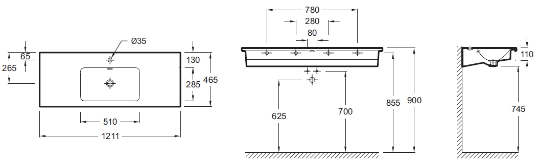 Подвесная раковина-столешница с гладкой нижней поверхностью (для установки на мебель), 120 х 46 см.