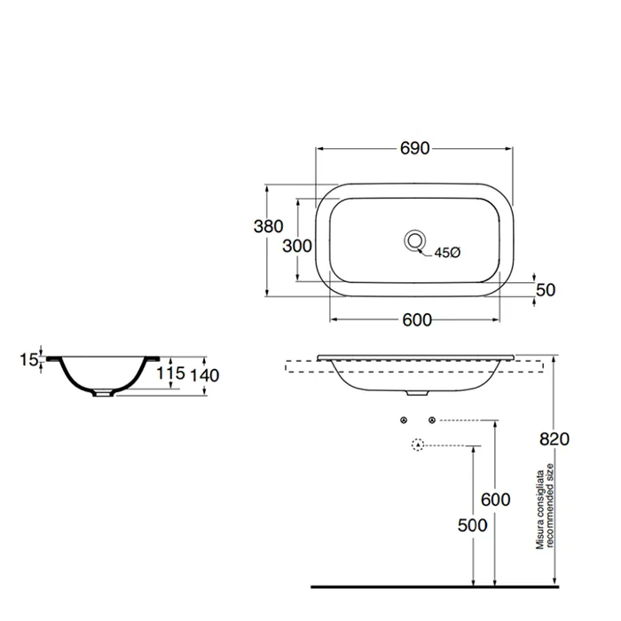 Раковина встраиваемая на столешн. без отв. под смеситель Azzurra Glaze 69x38см, белый GLLI06938000BI (GLZ 69x38/IN bi)