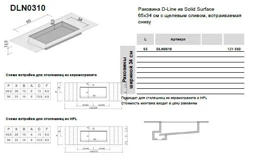 Раковина Brenta D-Line 65х34 см из композита Solid Surface встраиваемая снизу с щелевым сливом DLN0310