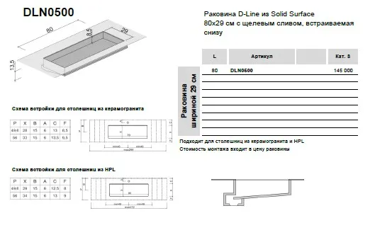 Раковина Brenta D-Line 80х29 см из композита Solid Surface встраиваемая снизу с щелевым сливом DLN0500
