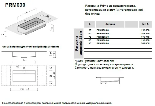 Раковина Brenta Prime 60х28 см из керамогранита встраиваемая снизу (интегрированная) PRM030.60