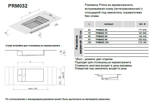 Раковина Brenta Prime 60х33 см из керамогранита встраиваемая снизу (интегрированная) PRM032.60