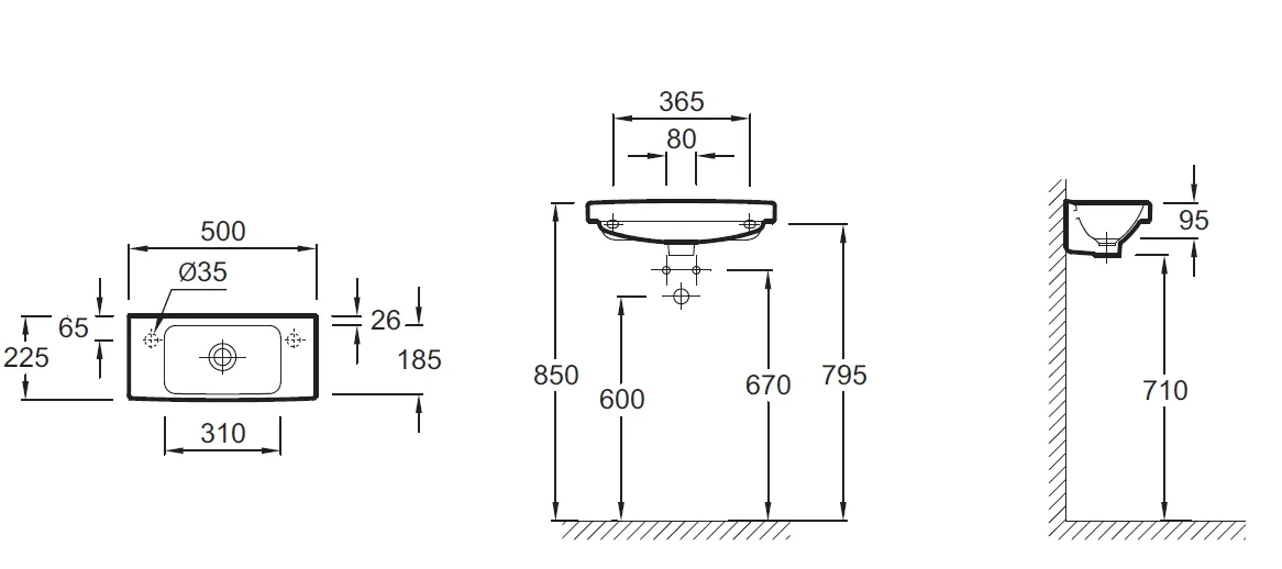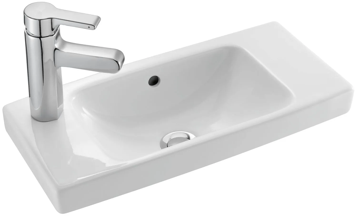 Рукомойник (50 x 22,5 см), с 2 размеченными отверстиями для смесителей, без переливного отверстия.