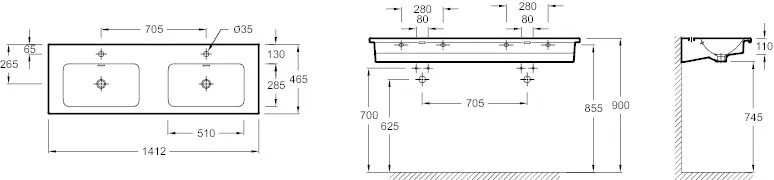 - Готовых отверстий под смесители: одно на каждой раковине.