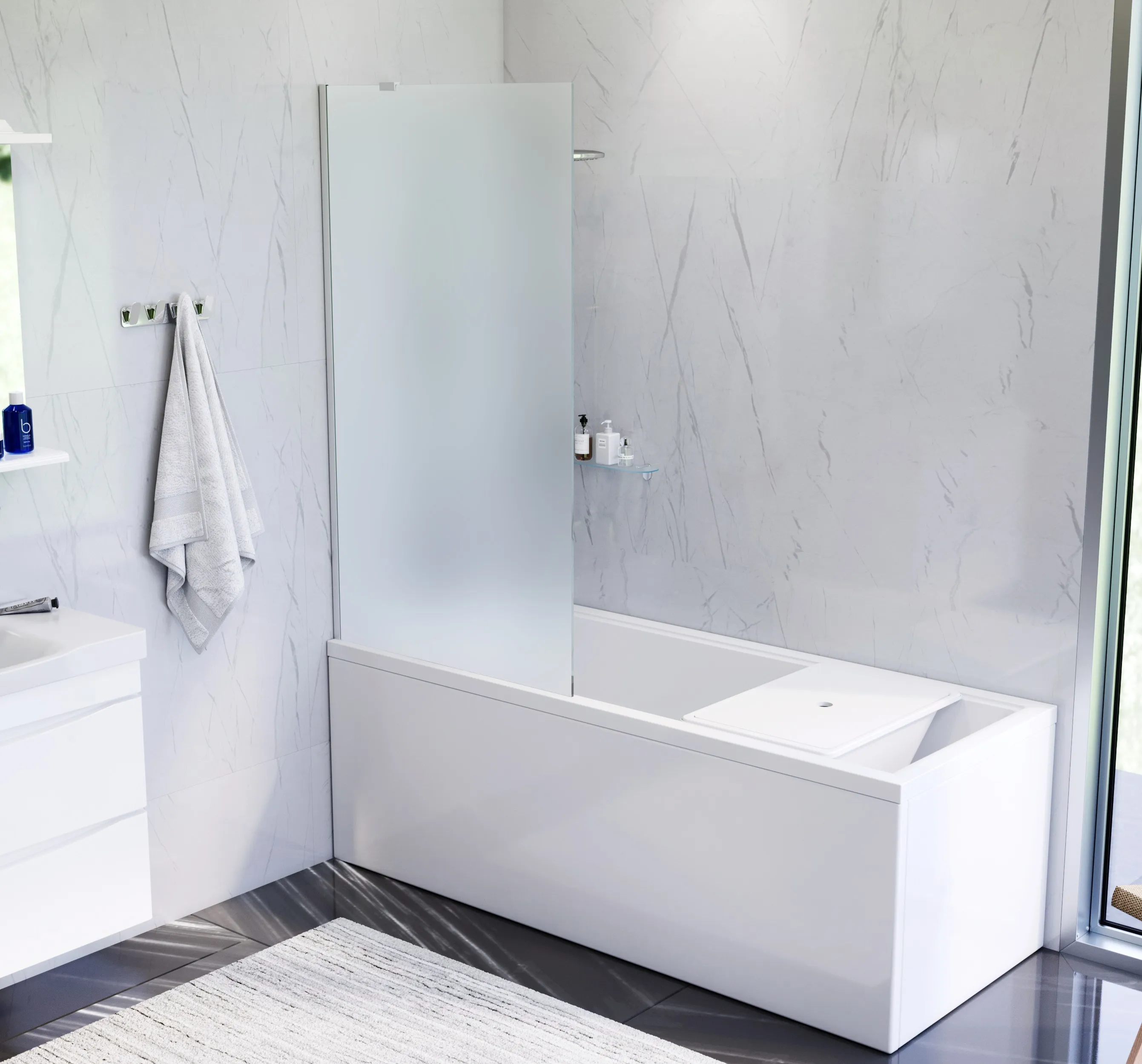 Шторка на борт ванны Gem выполнена в соответствующем всей коллекции дизайне: чистые грани четкие формы и безупречный стиль.