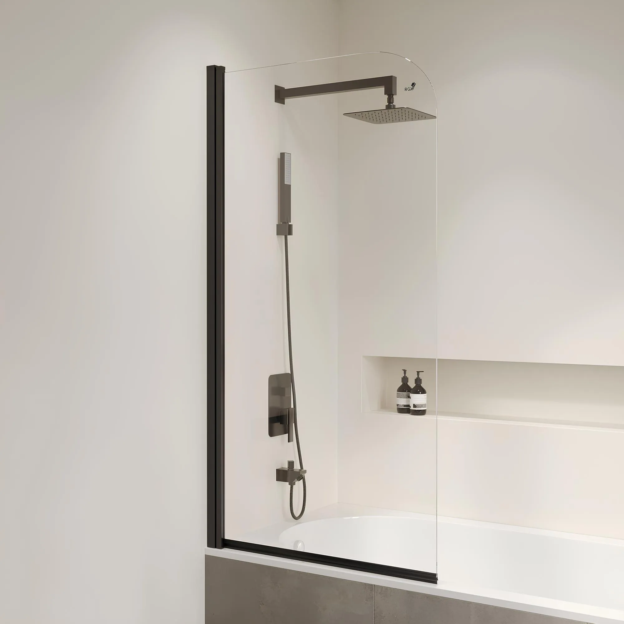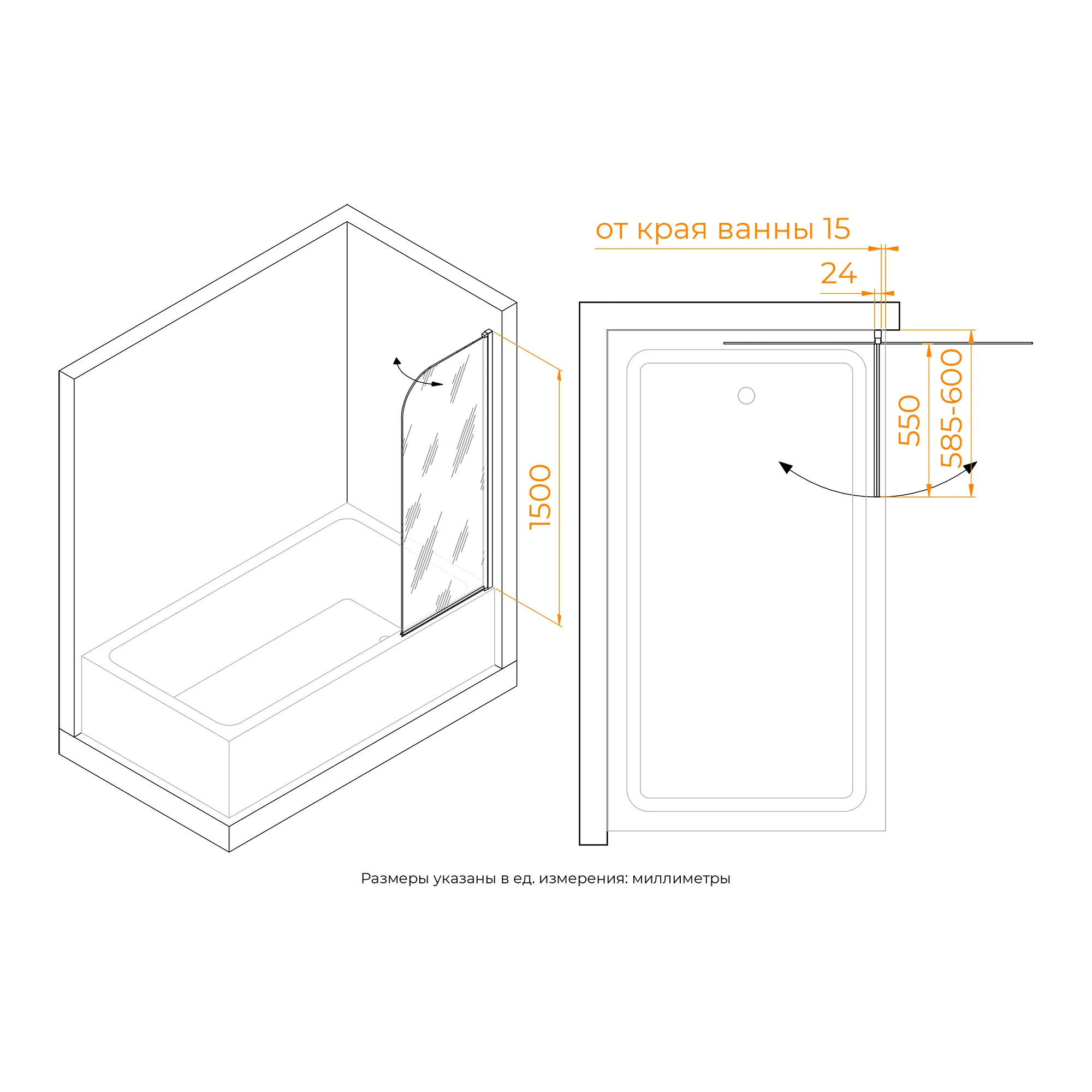 Профиль шторки окрашен в черный цвет, что придает ему стильный и современный внешний вид, что легко подойдет к любому дизайну ванной комнаты. Высота стеклянной шторки составляет 1500 мм, что позволяет использовать ее даже в очень высоких ванных.
