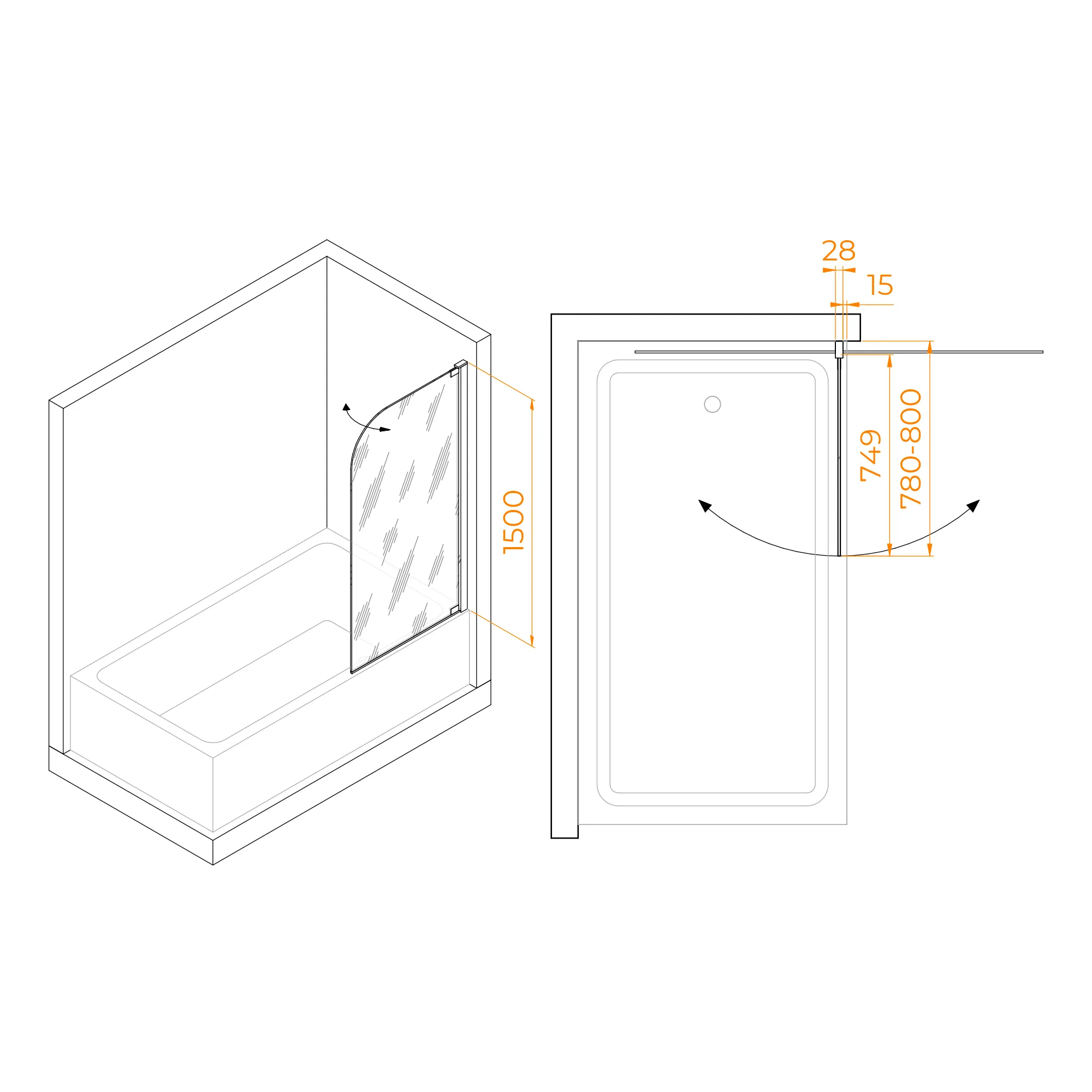 Высота шторки составляет 1500 мм, что позволяет ей легко справляться даже с высокими стенками ванны. Конструкция створки шторки маятниковая, что позволяет легко и быстро открывать и закрывать ее.