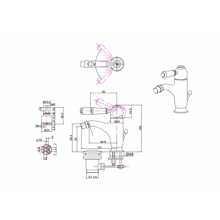Смеситель для биде Burlington 1/4 оборота, с донным клапаном хром T15-QT