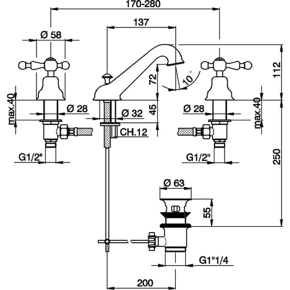 Смеситель для биде Cisal Arcana America на 3 отверстия, с донным клапаном, хром AA00102021