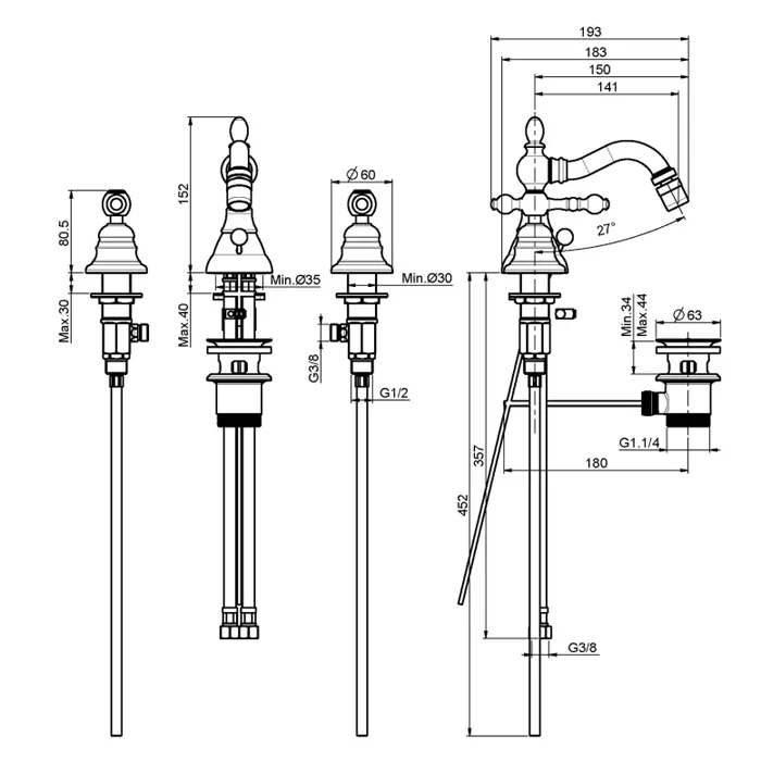 Смеситель для биде Fima Carlo Frattini Epoque на 3 отверстия, с вращающимся изливом, с донным клапаном, бронза F5052BR