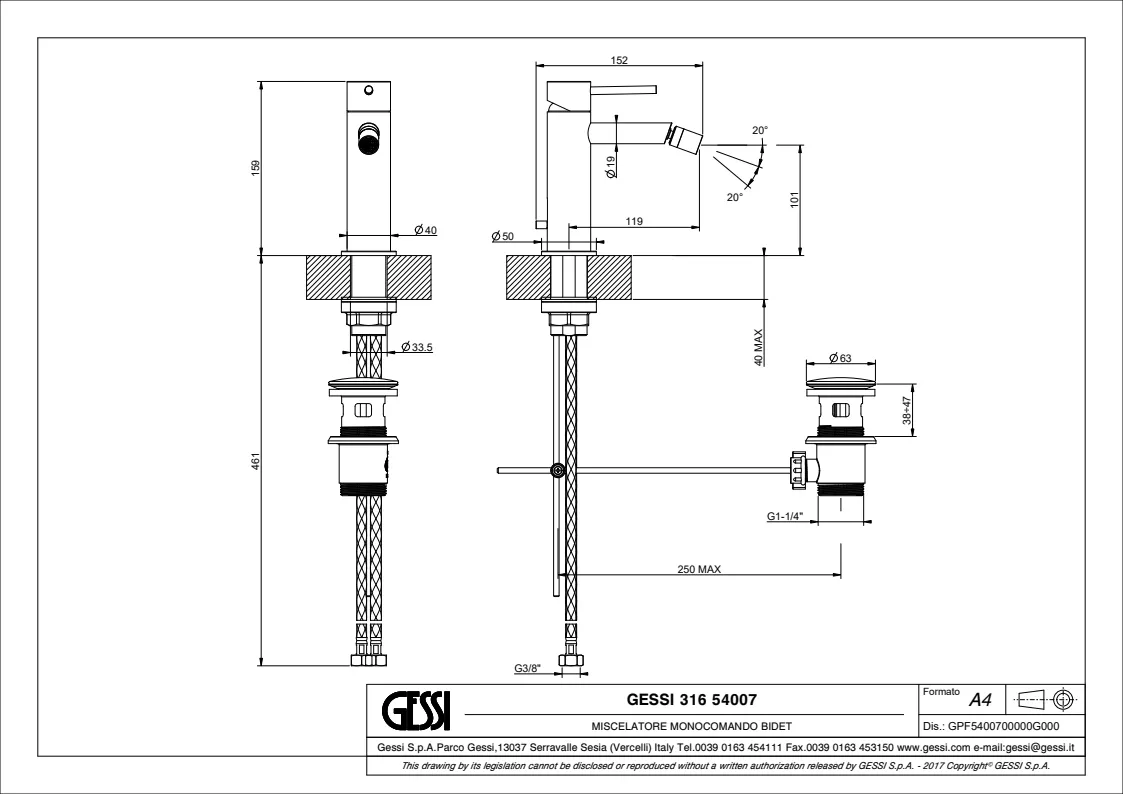 Смеситель однорычажный для биде Gessi 316 Flessa 54007.239 в цвете сталь матовая.