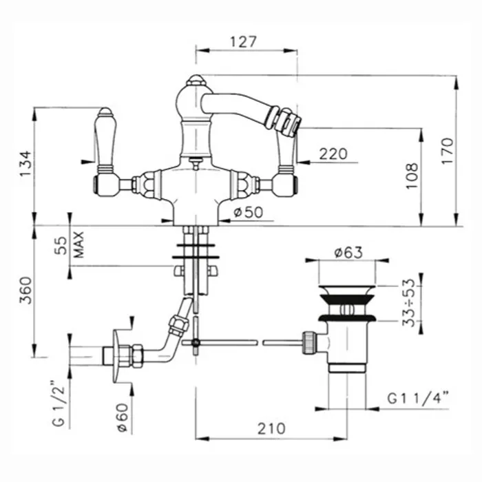 Смеситель для биде Nicolazzi El Capitan с 2мя ручками, на 1 отв., с донным клапаном, излив 127мм, bronze plated 1434BZ69