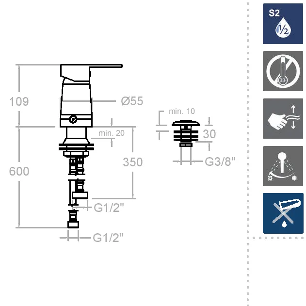 - Система экономии воды и энергии S2 позволяет открывать кран в два этапа, снижая потребление воды до 50% без потери комфорта.