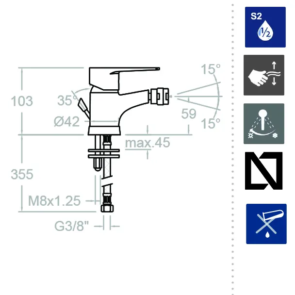 Технические характеристики Ramonsoler Titanium 1803 удовлетворяют строгим стандартам: сопротивление статическому давлению до 10 бар и выдерживание гидравлических ударов в 25 бар. Оптимальное давление для работы составляет 3 бара, а допустимый диапазон — от 1 до 5 бар.