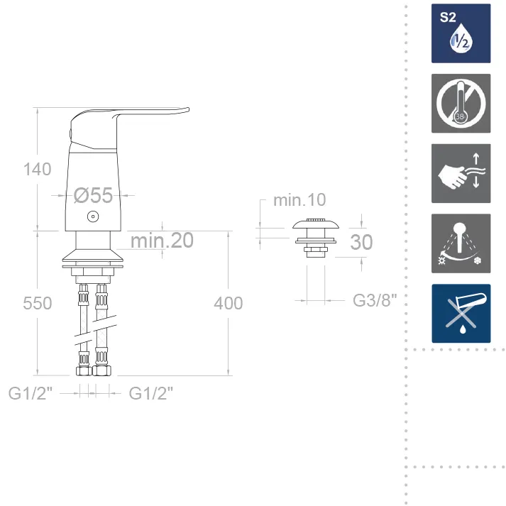 Смеситель выдерживает гидравлический удар до 25 бар и функционирует при давлении от 1 до 5 бар, при рекомендуемом значении 3 бар. При этом уровень звука при работе составляет менее 20 дБ, что делает его почти бесшумным. Рекомендуется использовать горячую воду при температуре до 55 °С, а максимальная кратковременная рабочая температура достигает 90 °С (до 1 часа).