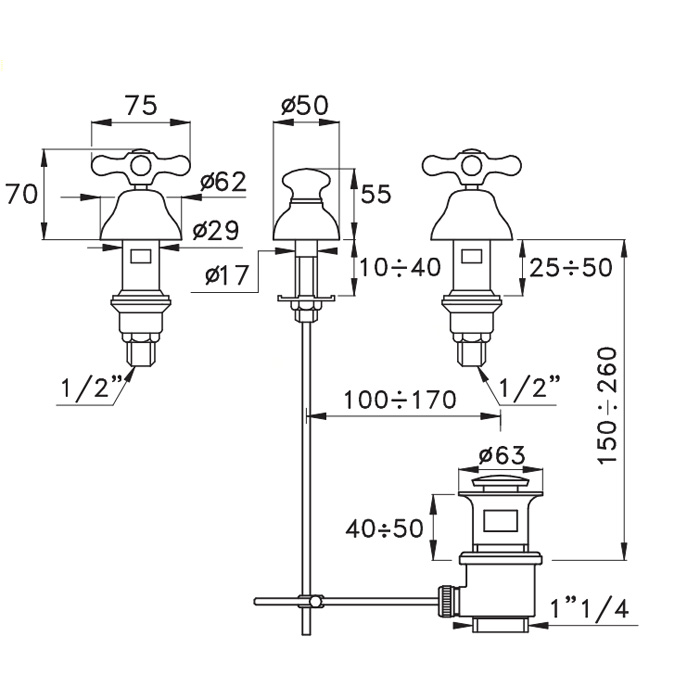 Смеситель для биде Stella Roma на 3 отверстия 3600, без излива, с донным клапаном, хром RM 00200 CR00