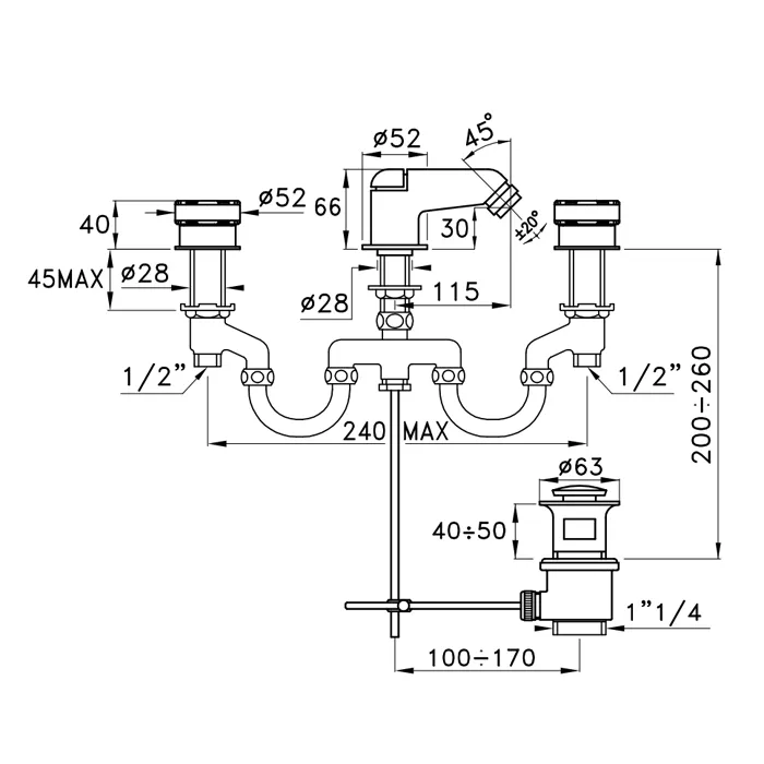 Смеситель для биде Stella Timeaster на 3 отверстия 3601, с донным клапаном, хром, ручка белая TA 00201 CR00BI