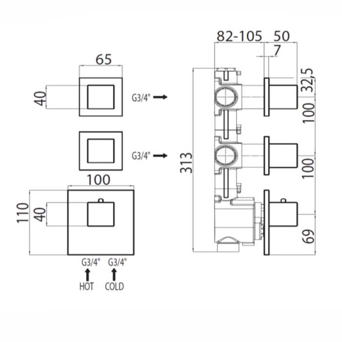 Bossini Rectangular Термостат для душа, встраиваемый, с девиаторм/запорным вентилем на 2 - 4 выхода,