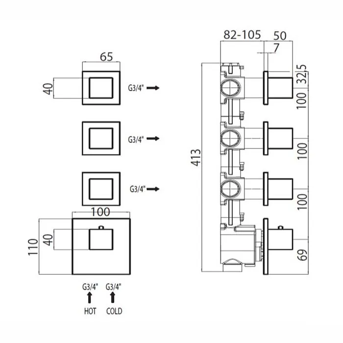 Bossini Rectangular Термостат для душа, встраиваемый, с девиаторм/запорным вентилем на 3 - 6 выходов