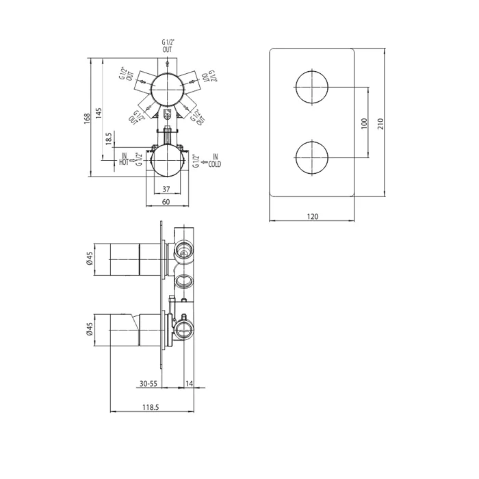 Наружная часть встраиваемого монорычажного Bossini Nobu универсального смесителя Nobu на 2-5 выходов. цвет Mat brushed S.S.