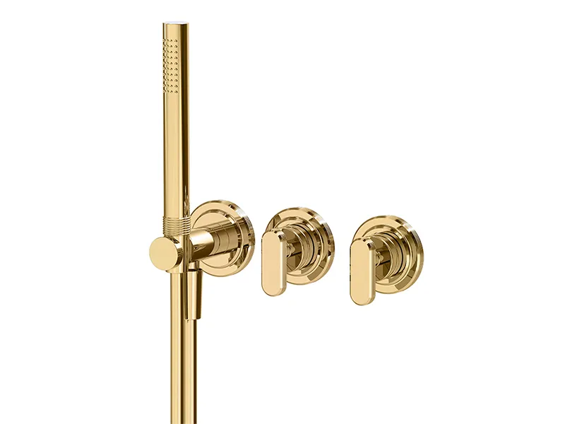Встроенный смеситель для душа Fima Carlo Frattini PARK LANE F1319WX8OS на 2 источника с душевым комплектом, цвет золото брашированное. Только внешняя часть, ручной душ с защитой от извести анти-кальк, держатель для душа с подводом воды, переключатель, гибкий шланг хромалюкс 1500 мм, металлическая пластина, внутренняя часть (арт.F3400W) заказывается отдельно.