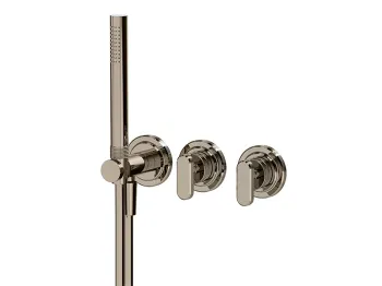 Встроенный смеситель для душа Fima Carlo Frattini PARK LANE F1319WX8SN на 2 источника с душевым комплектом, цвет никель брашированный. Только внешняя часть, ручной душ с защитой от извести анти-кальк, держатель для душа с подводом воды, переключатель, гибкий шланг хромалюкс 1500 мм, металлическая пластина, внутренняя часть (арт.F3400W) заказывается отдельно.