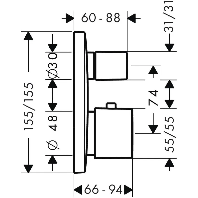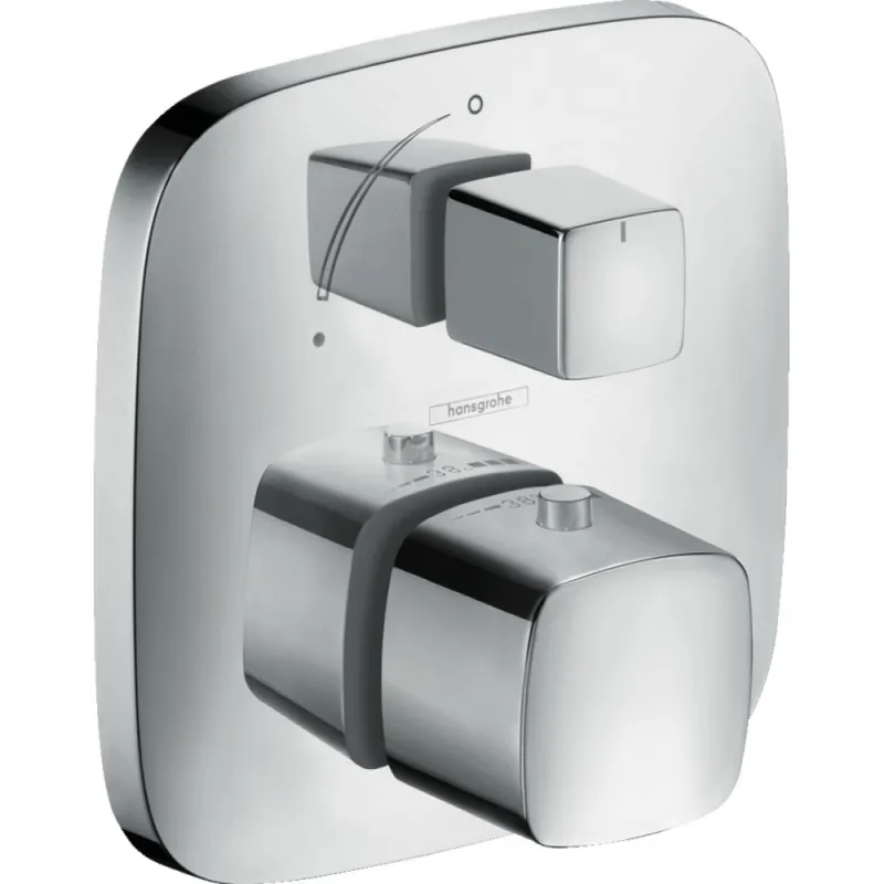 Термостат в составе рукоятки, гильзы, функционального блока и термоэлемента, регулирующего температуру воды. Установка предусматривает внешний монтаж с установкой внутреннего устройства ibox universal