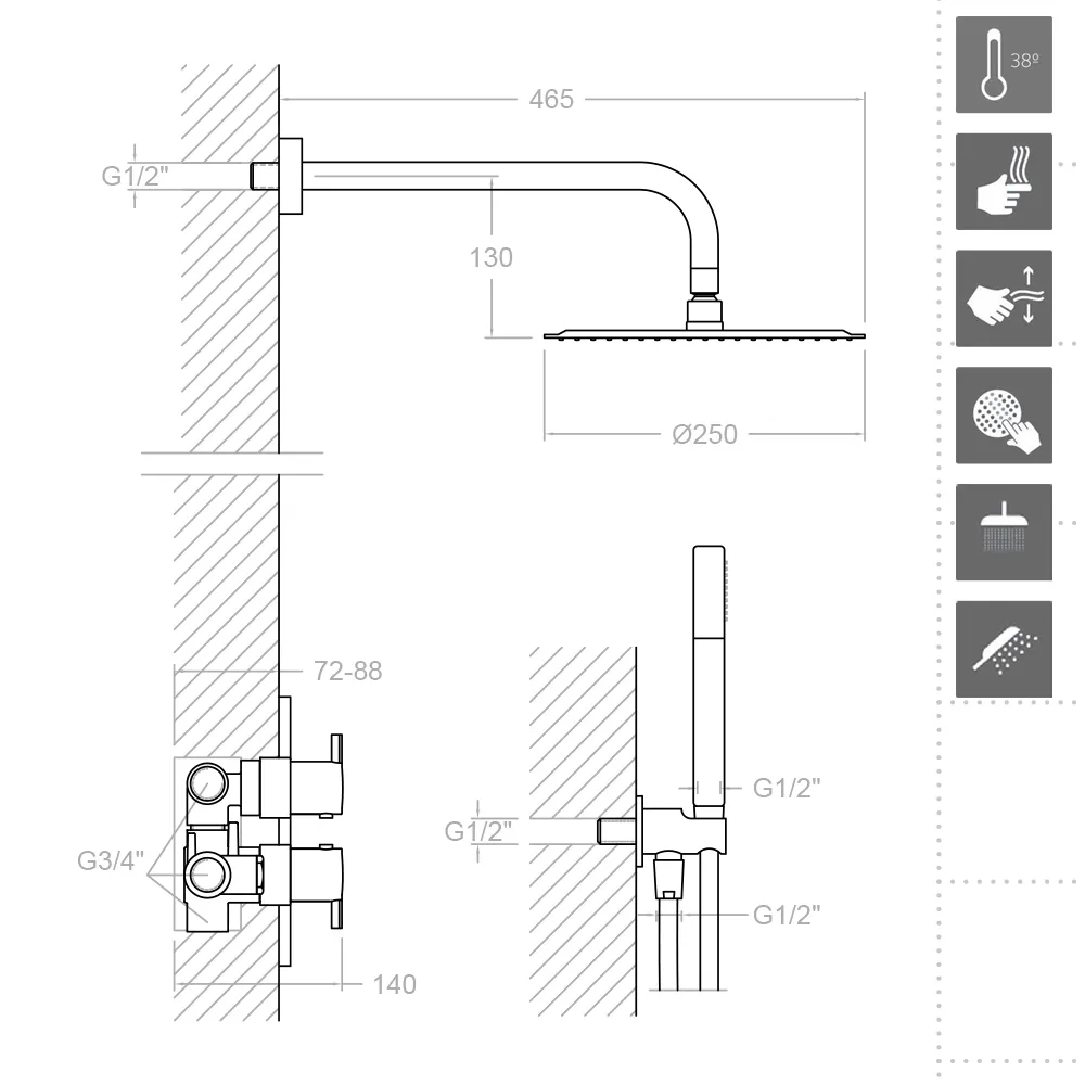 Смеситель для душа Ramonsoler Drako встраиваемый термостатический с тропическим и ручным душем K3387011