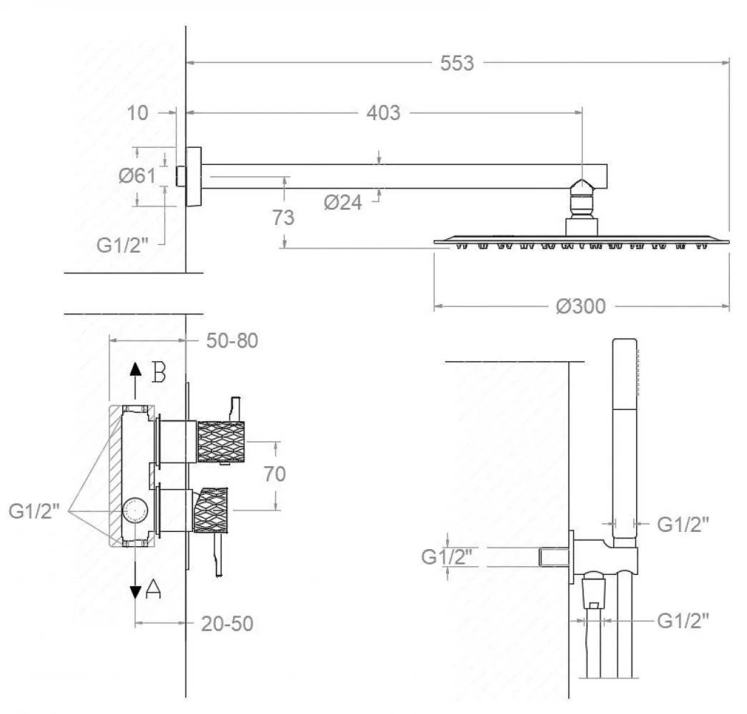 Смеситель для душа Ramonsoler Odisea встраиваемый на 2 выхода с тропическим и ручным душем joya графит K5915122GR