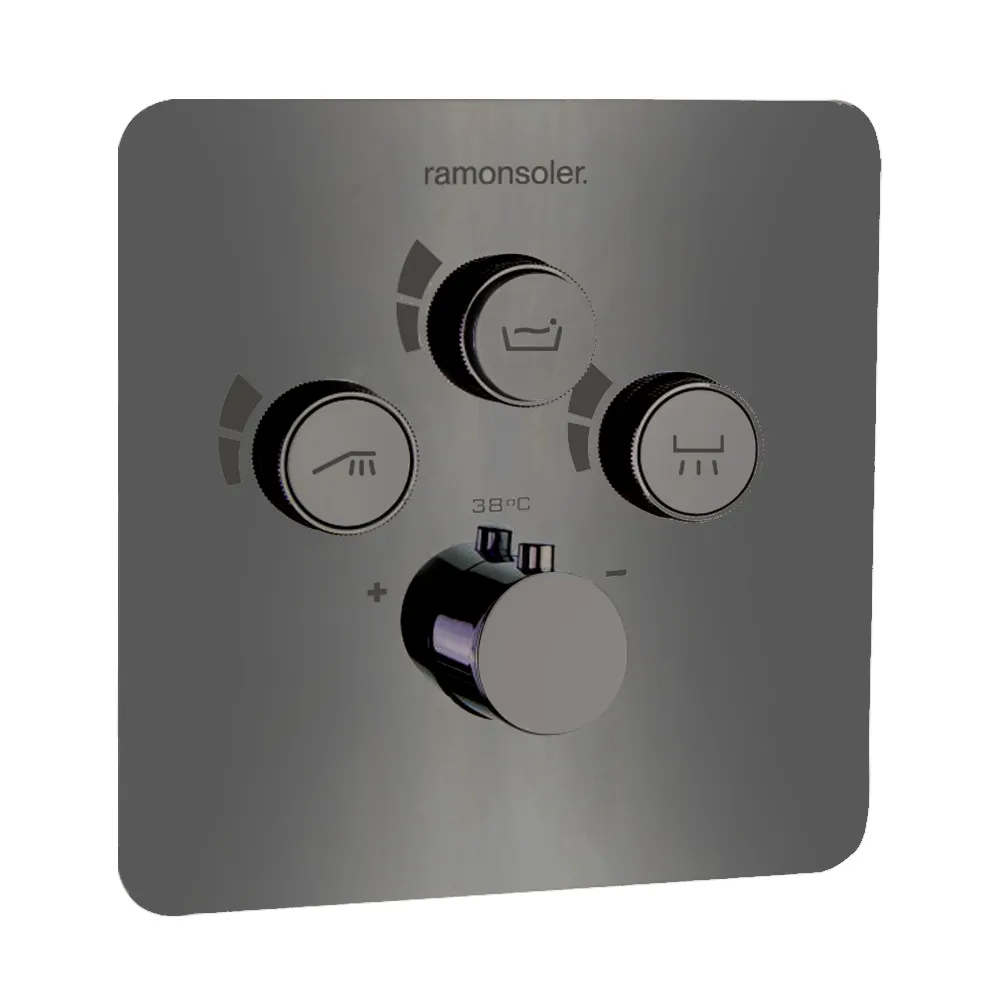 Смеситель уникален своим встраиваемым дизайном, который гармонично сочетается с любыми коллекциями Ramonsoler. Надежность и простота использования достигаются благодаря панели с несколькими кнопками для управления режимами душа и эргономичному регулятору температуры. В основе работы этого смесителя лежит термостатический картридж с системой безопасности Hot Block, который поддерживает безопасную температуру, а технология Termostop ограничивает её на уровне 38 °C, предохраняя вас от ожогов.