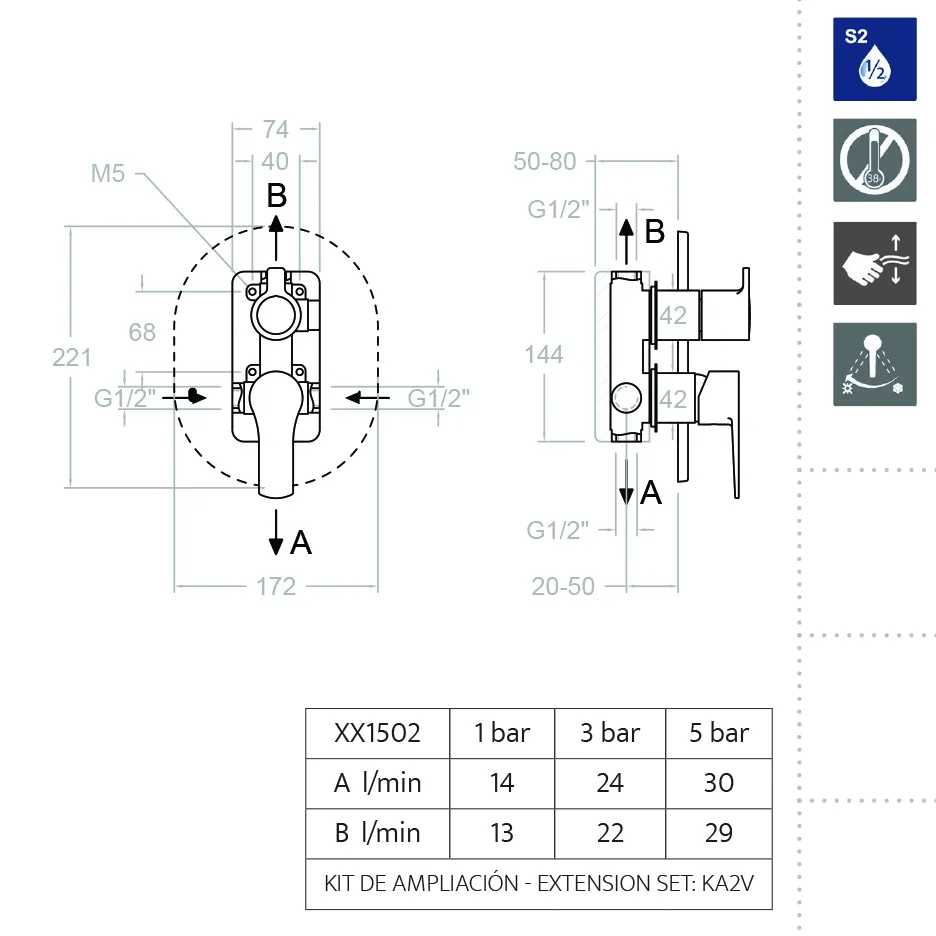 Смеситель демонстрирует выдающуюся производительность с расходом воды до 21 литра в минуту для душа и 22 литра для ванны при рекомендуемом давлении 3 бара. Он также выдерживает высокий уровень статического и гидравлического давления до 10 и 25 бар соответственно, при этом функционируя в температурном диапазоне до 65°C, с кратковременной устойчивостью до 90°C.