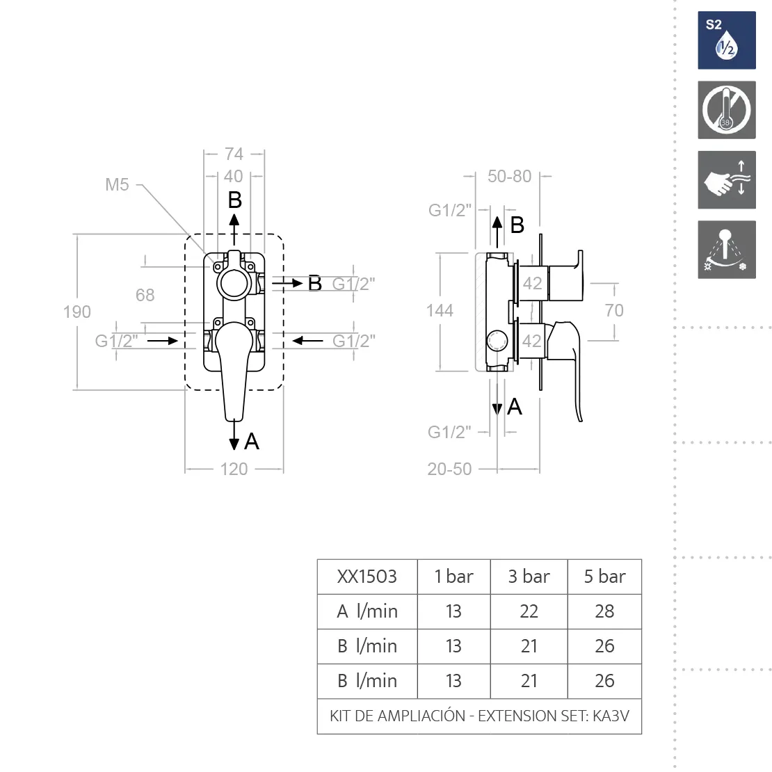 Смеситель Ramonsoler Ypsilon поддерживает широкий диапазон рабочих давлений от 1 до 5 бар, что делает его универсальным решением для любых систем подачи воды. Рекомендуемая температура горячей воды — 55 °C, однако он способен выдерживать до 90 °C в течение часа.