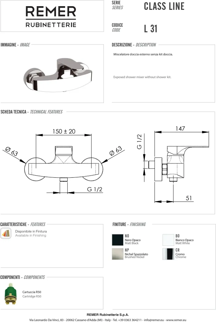 Смеситель из коллекции Class Line бренда Remer — это идеальный выбор для современных ванных комнат. Он представляет собой однорычажный смеситель для душа, выполненный в стильном хромовом исполнении с глянцевой поверхностью. Благодаря настенному монтажу, этот смеситель экономит пространство и обеспечивает удобство в использовании. Изделие изготовлено из высококачественной латуни, что гарантирует его долговечность и устойчивость к коррозии. Установка возможна благодаря стандартной подводке 1/2" с межосевым расстоянием 150 мм. С таким смесителем ваша ванная комната станет не только функциональной, но и эстетически привлекательной. Доступна гарантия на 5 лет, что подтверждает надежность и долговечность этого продукта.